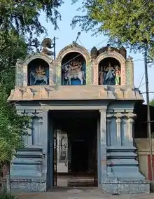 The temple has a beautiful nandhi mandapa. [2] Facing south, it has a entrance. In the west stuccos of Shiva, Parvati are found sitting on rishaba. They are flanked by Vinayaka, Subramania with his consorts Valli and Deivanai. Vinayaka and Sunbramania are found with their vahanas mouse and peacock respectively. After the entrance, in the front mandapa the shrine of the Goddess is found. In the left, facing east, the shrine of the presiding deity is found. In the outer prakara shrines of Vinayaka, Subramania with his consorts Valli and Deivanai, Gajalakshmi, Chandikesvarar and Navagraha are found. The shrine of Navagraha is found in lotus shape. Very near to them nandhi mandapa is found.[3]