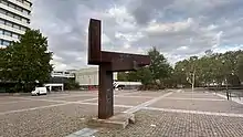 The building has a plaza with a bronze-steel sculpture called "Balance."[2] Also near the plaza are the ruins of Emperor Barbarossa's castle. Local skateboarders are seen near the plaza during the late hours of the day. On the top floor there is a restaurant and bar named twenty-one.[3] The restaurant offers panoramic views of the city as far as the Palatinate Forest. Also seen are many of the landmarks of the city, such as the Fritz-Walter-Stadium and the several massive cathedrals dotted around Downtown Kaiserslautern. Very near city hall also is the K-Town Mall. Near the building, all the city buses meet at the station near the town, unusual because most towns in Germany have their main bus station near their train station.
