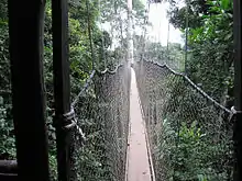 The park has a long series of hanging bridges known as the Kakum Canopy Walkway at the forest canopy level to provide access to the forest, which is a unique feature in the entire African continent. At 40 m (130 ft) height, the visitor can approach the limits and view plants and animals from a vantage point that would otherwise be inaccessible to people. The canopy walkway passes over 7 bridges and runs over a length of 330 m (1,080 ft). Some of the tree canopies are more than 50 metres (160 ft) in height. Built with wire rope, aluminium ladders, wooden planks, it is secured by a series of netting for safety purposes. An additional viewing platform that will allow visitors to climb into the canopy without braving the canopy walkway is currently under construction.[6] The Canopy Walkway was built by two Canadian engineers from Vancouver[64] with the assistance of five (5) Ghanaians - the latter (staff of Ghana Heritage Conservation Trust- managers of the Kakum National Park Visitor Centre)have been maintaining the facility ever since.