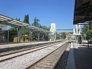 In 2001 the infrastructure element of OSE was created, known as GAIAOSE. It would henceforth be responsible for the maintenance of stations, bridges and other network elements, as well as the leasing and the sale of railway assets.[1] In 2005, TrainOSE was created as a brand within OSE to concentrate on rail services and passenger interfaces. In 2009, with the Greek debt crisis unfolding OSE's Management was forced to reduce services across the network. Timetables were cut back, and routes closed as the government-run entity attempted to reduce overheads. In 2015 a 15-year-old child was airlifted to a hospital after being electrocuted at the station.[8] In 2017 OSE's passenger transport sector was privatised as TrainOSE, currently, a wholly-owned subsidiary of Ferrovie dello Stato Italiane[9] infrastructure, including stations, remained under the control of OSE. In July 2022, the station began being served by Hellenic Train, the rebranded TranOSE[10]
