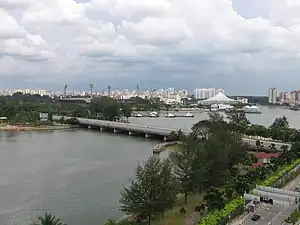 Due to the high concentration of waterways in Kallang, many bridges were constructed to cross over these rivers and canals. Some famous bridges found in Kallang include the Merdeka Bridge, Benjamin Sheares Bridge (Singapore's tallest and longest bridge; reaches its highest point of 29 metres at Kallang Basin) and the Tanjong Rhu Footbridge (the first suspension bridge in Singapore).[24][25][26]