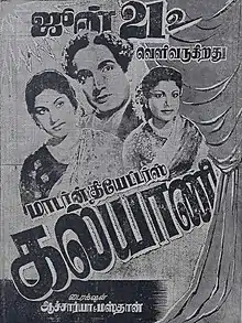 Kalyani is a 1952 Indian Tamil-language psychological drama film directed by Acharya (T. G. Raghavachari) and M. Masthan, and produced by T. R. Sundaram of Modern Theatres. The film portrays the life of a mentally-deranged man and is heavily inspired by 1948 American film The Snake Pit. It was later remade in Telugu as Atthainti Kaapuram in 1952. Kalyani stars M. N. Nambiar. B. S. Saroja, D. Balasubramaniam, M. G. Chakrapani and T. P. Muthulakshmi had supporting roles.[1]