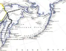 By the law of June 30, 1909, the Kamchatka Oblast was created for the third time. The Oblast included Petropavlovsk, Okhotsk, Gizhiginsky, Anadyr Uyezds and the Commander Islands, separated from the Primorskaya Oblast. At the same time, in the territory of Chukotka (part of the Anadyr Uyezd) the Chukotka Uyezd was formed. In 1922, the Kamchatka Oblast was transformed into the Kamchatka Governorate.[1]