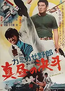 Kamikaze Man: Duel at Noon (カミカゼ野郎 真昼の決斗, Kamikaze yarō: Mahiru no kettō) (also known as The Kamikaze Guy[1][2][3][4][5] and The Kamikaze Guy: Duel at High Noon,[6] is a 1966 Japanese crime action comedy film directed by Kinji Fukasaku and starring Sonny Chiba. This was the second film shot by Fukasaku in color, the first being Gang vs. G-Men (1962).