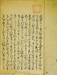 Famous kanazōshi writers include Asai Ryōi (d. 1691) and Suzuki Shōsan (1579-1655). Main works include: Nise Monogatari (Tale of Falsehoods: A Parody of Tales of Ise), Shimizu monogatari (Tale of Shimizu), and Tōkaidō meishoki (Famous Sites on the Tokaido Highway). The most celebrated example of the genre is Ryōi’s Ukiyo monogatari (Tales of the Floating World, 1661), a comedic tale about a young man named Hyōtarō who gets himself into all kinds of trouble with gambling, prostitutes, and the like, and then learns valuable lessons about the proper way to live one’s life from town elders. One translation from Europe was distributed as kanazōshi – a three-volume edition of Aesop's Fables, from 1593, entitled Isopo Monogatari (伊曾保物語).[1] This was the sole Western work to survive in later publication after the expulsion of Westerners from Japan.[2]