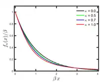 The Kaniadakis exponential distribution (or κ-exponential distribution) is a probability distribution arising from the maximization of the Kaniadakis entropy under appropriate constraints. It is one example of a Kaniadakis distribution. The κ-exponential is a generalization of the exponential distribution in the same way that Kaniadakis entropy is a generalization of standard Boltzmann–Gibbs entropy or Shannon entropy.[1] The κ-exponential distribution of Type I is a particular case of the κ-Gamma distribution, whilst the κ-exponential distribution of Type II is a particular case of the κ-Weibull distribution.
