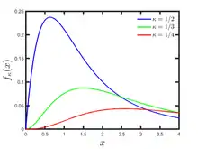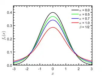 In statistics, a Kaniadakis distribution (also known as κ-distribution) is a statistical distribution that emerges from the Kaniadakis statistics.[1] There are several families of Kaniadakis distributions related to different constraints used in the maximization of the Kaniadakis entropy, such as the κ-Exponential distribution, κ-Gaussian distribution, Kaniadakis κ-Gamma distribution and κ-Weibull distribution. The κ-distributions have been applied for modeling a vast phenomenology of experimental statistical distributions in natural or artificial complex systems, such as, in epidemiology,[2] quantum statistics,[3][4][5] in astrophysics and cosmology,[6][7][8] in geophysics,[9][10][11] in economy,[12][13][14] in machine learning.[15]