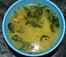 Kanji (Malayalam: കഞ്ഞി) is a rice water based dish traditionally prepared in Kerala. Depending on how it is prepared, it is eaten with fish, soup or curry. It is one of the Chappan Bhog (56 food items also known as Mahaprasad) offered to the Hindu god Jagannath of Puri as part of the last meal of the day (known as Badaw Singhara Bhogaw).[1] During the Odia festival of Kanji Anla Osha,[2][3] kanji is offered to the Hindu goddess Sathi.