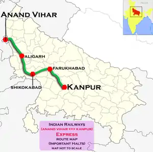 The Kanpur Central–Anand Vihar Terminal Express is an Express train belonging to North Central Railway zone that runs between Kanpur Central and Anand Vihar Terminal in India. It is currently being operated with 14151/14152 train numbers on a weekly basis.[1][2]