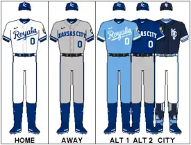 The Royals' home uniform remained almost unchanged from its first season. The original design featured blue arm and neck piping, along with "Royals" in blue and in script lettering. The road uniform was inverted from the home uniform, with "Kansas City" written in blue, in script lettering and in an arch arrangement. For the 1971 season the "Kansas City" on the road uniforms were changed to block lettering, while both uniforms added a roundel containing the team logo on the left sleeve. The blue cap with "KC" stitched in front was also introduced and remains in use today.[1]