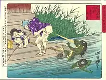 Another method of defeat involves shogi or sumo wrestling: a kappa sometimes challenges a human being to wrestle or engage in other tests of skill.[25] This tendency is easily used to encourage the kappa to spill the water from its sara. One notable example of this method is the folktale of a farmer who promises his daughter's hand in marriage to a kappa in return for the creature irrigating his land. The farmer's daughter challenges the kappa to submerge several gourds in water. When the kappa fails in its task, it retreats, saving the farmer's daughter from the marriage.[15] Kappa have also been driven away by their aversion to iron, sesame, or ginger.[26]