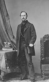 During the Schleswig–Holstein question, Duke Charles was a supporter of the Schleswig–Holstein movement. In 1846, as head of the House of Glücksburg, he protested against King Christian VIII's open letter on the succession in the duchies of Schleswig and Holstein, and out of dissatisfaction resigned from the Army in August of the same year.[5] Nevertheless, eight days after his accession to the throne, King Frederick VII gave him the rank of major general.[6] Duke Karl actively sided against Denmark during the First Schleswig War from 1848 to 1851, which caused the ducal couple's relations with the Danish Royal family to be severed. During the war, he initially took command of one of the provisional Schleswig-Holstein government's Infantry Brigades, but already in the fall of 1848, he and his wife moved to Dresden in the Kingdom of Saxony.[5] There they resided until 1852, when they returned to Denmark after am uneasy reconciliation was established.[6] As a result of his rebellion against the Danish government, Duke Carl lost his Danish orders and decorations and only had them restored in 1856.[5] Also, in 1854, he had to cede the family seat Glücksburg Castle to King Frederick VII of Denmark who used the castle as his summer residence and also died there in 1863.[7]