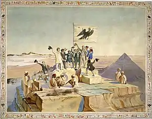 In 1842, Lepsius was commissioned (at the recommendation of the minister of instruction, Johann Eichhorn, and the scientists Alexander von Humboldt and Christian Charles Josias Bunsen) by King Frederich Wilhelm IV of Prussia to lead an expedition to Egypt and the Sudan to explore and record the remains of the ancient Egyptian civilization. The Prussian expedition was modelled after the earlier Napoleonic mission, with surveyors, draftsmen, and other specialists.[5] The mission reached Giza in November 1842 and spent six months making some of the first scientific studies of the pyramids of Giza, Abusir, Saqqara, and Dahshur. They discovered 67 pyramids recorded in the pioneering Lepsius list of pyramids and more than 130 tombs of noblemen in the area.[5] While at the Great Pyramid of Giza, Lepsius inscribed a graffito written in Egyptian hieroglyphs that honours Friedrich Wilhelm IV above the pyramid's original entrance; it is still visible.[6]