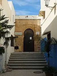 The mosque measures about 26.5 by 25 metres but its outline is partly irregular due to modifications over the centuries.[21] Its exterior is mainly made of stone while the arches of the interior are made in brick.[21] Like many medieval western Islamic mosques, its qibla (direction of prayer) is not aligned with the true direction of Mecca but faces mostly south, following an older tradition based on a hadith.[22] The mosque can be entered via four horseshoe arch doorways.[21] Inside is a rectangular courtyard (sahn) surrounded by galleries on three sides and by the prayer hall to the south/southeast. The layout of the prayer hall follows the typical "T"-plan of medieval Moroccan mosques: it is split by rows of arches into seven "naves" running perpendicular to the qibla wall, of which the central one is wider than the others and is aligned with the mihrab (niche symbolizing the direction of prayer).[21] The walls and arches of the mosque's interior are painted white, with the lower walls decorated with Moroccan tilework while the upper walls and the spandrels of the arches are decorated with carved stucco.[22] The mihrab is the most richly decorated feature, again featuring ornate patterns in carved stucco. This decoration, however, is of recent date.[21]