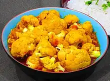 Rice is the staple food and has been so since ancient times.[6] The equivalent for the phrase "bread and butter" in Kashmiri is haakh-batta (greens and rice).[7] Meat along with rice, some vegetables and salad are prepared on special occasions like Eid.[8] Gravies are thin, very flavourful with no floating oil or masalas.[9] A typical everyday Kashmiri meal — lunch and dinner — consists of a generous serving of rice (about 250 gms), mutton (100 gms) and vegetables (about 100gms, mostly greens) cooked in oil, and yoghurt (50 to 250 gms).[7]