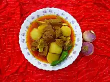Kashmiris consume meat voraciously.[10][11] They share a love for lamb; the love a Kashmiri has for meat is unparalleled.[12][11] A good Kashmiri would not touch frozen meat, they feel it is not suited for the local cuisine.[13] They are, per capita, the highest mutton consumers in the subcontinent.[12] According to official data, around 2.2 million sheep are slaughtered in Kashmir every year on an average adding up to 21,000 tonnes annual meat consumption in the region.[14] Kashmiri Pandits are all Saraswat Brahmins, and hence avid meat-eaters.[15] The amount of mutton that is generally required to be bought for a Kashmiri Pandit wedding feast is 650 gm per head (not considering chicken).[16] Kashmiri Muslims prefer goat, especially young, while Kashmiri Pandits choose lamb.[17] Meat is called Neni by Pandits and Maaz by Muslims in Kashmir.[18] Asafoetida is mixed with yoghurt by Pandits and shallot mixed with garlic by Muslims.[5] In a majority of Kashmiri Pandit and Muslim cooking, bread is not part of the meal; it's always rice at lunch or dinner.[19] Bread is only eaten with tea in the morning or evening.[19] They may be bought from neighbourhood bakeries (qandurwan).[9]
