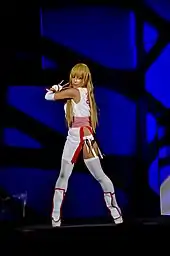 According to Kotaku, Kasumi has become "nothing short of an icon" in Japan by 2006.[173] Talking about her popularity in the country, Itagaki said in 2004, "It's almost like there are too many Kasumi covers. If you look at Japanese magazines, maybe 10% of them have Kasumi on their cover."[174] She was voted the DOA series' most popular character among the Japanese fans in the publisher Koei Tecmo's official poll in 2014, receiving over 19% of votes.[175] Kasumi has achieved a high popularity overseas as well. In 2005, she won G4's show Video Game Vixens in the category 'Dressed to Kill'.[176] That same year, Kasumi also won the "Who is the hottest female character on Xbox?" poll by Official Xbox Magazine, when 52% of all votes were cast on her (Street Fighter's Chun-Li came second with 11%), with the magazine's staff commenting that it was no surprise to them.[177] She won the G-Phoria 2007 award in the category "Best Hottest Babe", garnering 55% of all votes,[178][179] came third after Mai Shiranui from The King of Fighters and Chun-Li in a Korean Internet fan poll for White Day 2009,[180] just as she later did in poll for the most erotic girl in the history of fighting games conducted by Japanese web portal Goo in 2016[181] (coming fourth in 2018[182]), and was voted second in the "Miss of Video Games 2012" poll by Polish magazine PSX Extreme.[183] PSX Extreme's Daniel Żelazny ranked her blue shinobi attire as the eight best female costume in video games in 2014, noting she is one of favourite game characters among cosplayers.[184]