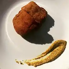 In modern times, Kasundi is popularly served with Bengali snacks like cutlets and chops, and deep-fried spicy treats, as it brings tartness and pungency to the flavours. It also can be served as a dip with other snacks, as well as sandwiches, pizzas, burgers, omelettes, salads and other food.[3] But, traditionally it was served neither with these treats nor in such quantities at home. In the past, it was stored with care, served sparingly and in small quantities, and paired with hot stir-fried greens, never fish or meat.[3][4] The practice of pairing kasundi with non-vegetarian dishes evolved in the commercial eateries, beginning with batter-fried fish.[3][4]