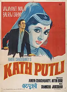 Kathputli (transl. Puppet) is a 1957 Pygmalion Black-and-white Hindi-language film produced by Ajit Chakraborty and Amiya Chakrabarty with their Sreerangam Productions. The film was the last film of director Amiya Chakrabarty, who had earlier directed Basant, Daag and Seema.[1][2] He died during the filming and Nitin Bose took up the mantle of director in the film.[3] The film stars Vyjayanthimala and Balraj Sahni in the lead with Jawahar Kaul, Agha, Kumari Kamala, C. S. Dubey, Sheela Kashmiri, Poonam and Laxman Rao, forming an ensemble cast.[4] The film's music was composed by the Shankar Jaikishan duo, with the lyrics by Shailendra and Hasrat Jaipuri.