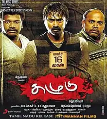 Kazhugu (transl. Eagle) is a 2012 Indian Tamil-language comedy thriller film written and directed by newcomer Sathyasiva, starring Krishna and Bindu Madhavi. The film, produced by Krishna's father K. K. Sekhar along with K. S. Madhubala, features music composed by Yuvan Shankar Raja. The story revolves around four persons, referred to as "Kazhugu", who recover the bodies of suicide victims who jump off a cliff.[1][2] The film, based on real-life incidents, has been shot in real locations, including Kodaikanal, Theni, and Munnar. It had been in making since late 2010 and eventually released on 16 March 2012,[3] to mixed reviews and became a sleeper hit.