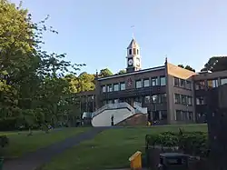 Located in North Staffordshire, Keele's campus is rural with many 19th-century architectural features such as Keele Hall predating the concrete and red-brick buildings of the modern university.[48] The campus occupies a 625-acre (253-hectare) rural campus close to the village of Keele and consists of extensive woods, lakes and Keele Hall set in Staffordshire Potteries. The estate was originally given by King Henry II of England to the Knights Templars in 1180. When the Templars were condemned and dissolved by the Council of Vienne in 1311, their possessions were annexed by the Knights Hospitallers until their dissolution by Henry VIII.[49] The estate was purchased from the Crown by the Sneyd family and remained their property until acquisition by the Stoke-on-Trent Corporation in 1948. Apart from increasing numbers of academic and residential buildings, other facilities include an astronomical observatory, arts and cultural programme, arboretum, Islamic centre, shops, cafés and places to eat and drink. The campus has science, business enterprise parks and conference centres. It is home to the Earth Science Education Unit (ESEU).[50] The chapel is located in the centre of the campus, close to the university library and student union. From the onset, Christian worship was central to university life. Lindsay, first principal of the University College, was an ardent Christian preaching every Sunday in the Library Reading room of Keele Hall.[51] A permanent structure was required and the chapel was built in 1965. Built from Staffordshire blue brick, the chapel accommodates different Christian traditions.