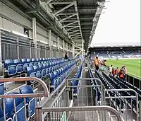 Opposite the Kenilworth Stand is the Oak Road End, which bears an electronic scoreboard on its roof and can seat a maximum of 1,800 fans.[33][16] Originally a home section, the Oak Road End was turned into a stand for away fans only at the start of the 1991–92 season. Early in the 2013–14 season, the Oak Road End was re-opened for home supporters for fixtures where visiting support was predicted to be especially low, with the section for away fans moved to A Block of the Kenilworth Stand for these games.[34] Later that season, it was announced that the stand was available for shared use between both home and away supporters, increasing Kenilworth Road's home capacity by 15%.[35] The Oak Road End has an entrance that is often considered unusual, requiring spectators to go through an entrance built into the row of houses and up stairs to the stand.[9][36]