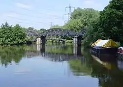 ![]() Kennington Railway Bridge from downstream. Beyond the bridge can be seen the crossing at the confluence of Hinksey Stream. | |