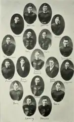 Last year no one imagined that a foot-ball team was within the possibilities of our college, because we hadn't the first requisite — men. This year we have men enough in school to organize a football team. The boys practiced faithfully and played some good games. One College sent their team here for a scheduled game. When they came they declined to play. Their reason was that the weather was too inclement, but it was not too bad for our boys to play and for our girls to gather en masse to help our boys win by their cheering. It was quite evident to us that the incoming team was scared. They did not expect to find well trained players. When they found men ready to win their ardor cooled and they went home without playing the game.[6]