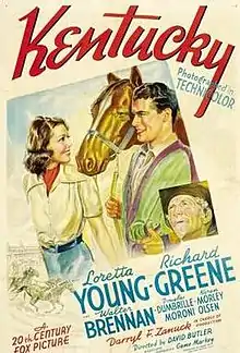 Kentucky is a 1938 American drama sports film with Loretta Young, Richard Greene, and Walter Brennan. It was directed by David Butler.[1] It is a Romeo and Juliet story of lovers Jack and Sally, set amidst Kentucky horseracing, in which a family feud goes back to the Civil War and is kept alive by Sally's Uncle Peter.
