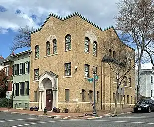 In 1910, six local Jewish merchants organized the Georgetown Hebrew Benevolent Society, which began to conduct religious services above a storefront on M Street, NW.[2] A year later, this kernel, now numbering 50 families, founded Kesher Israel Congregation,[3] which thus became the seventh synagogue organized in the nation's capital.[4]: 13 In 1915, the congregation acquired, renovated, and began to meet in a premises at 2801 N Street, NW. The current synagogue building, which was constructed in 1931 on that site[3][5] with a construction budget of $28,000,[6] is a contributing property to the Georgetown Historic District, a National Historic Landmark, listed on the National Register of Historic Places.[5]