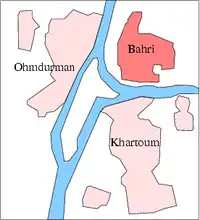 Khartoum North, or Khartoum Bahri (Arabic: الخرطوم بحري, romanized: al-Kharṭūm Baḥrī), is a city in Khartoum State, lying to the north of Khartoum city, the capital of Sudan.