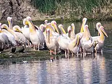 One can find both sea and shore birds, Every year over a hundreds of migratory birds species visit here to feed. In winter the sanctuary provides is a panorama of both migratory and resident birds like the Grey hypocolius, Forest wagtail, Grey-necked bunting, Black-headed bunting, Greylag goose, European roller, black-necked stork, Great white pelican, Dalmatian pelican, Lesser flamingo, Greater flamingo, great crested grebe, shikra, Indian spotted eagle, black ibis, Blue-cheeked bee-eater, Barn swallow, Crested lark, Isabelline shrike, black-winged kite, brahminy kite, pheasant-tailed jacana, great thick-knee, common greenshank, grey francolin, imperial eagle, little tern, black-tailed godwit, knob-billed duck, common crane, common teal, dunlin, garganey, Gadwall, marsh harrier, northern pintail, shoveler, Whistling ducks, Eurasian wigeon, pale harrier, demoiselle, cormorants and darters. Among the other wildlife found here are blue bull, jackal, wolf, jungle cat, mongoose, Indian hare and snakes.[8]