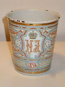 The beaker is among many that were distributed along with food presents and commemorative scarves to celebrate the coronation of Nicholas II, as had been the long-standing tradition. On the morning of 30 May [O.S. 18 May] 1896, over half a million revelers gathered on the ragged Khodynka Field in Moscow in anticipation of the presents and especially the commemorative cups (enameled tableware was still a great novelty at the time). That was far more than the field could safely accommodate, especially considering the many trenches and pits that dotted the plain in front of the Tsar's podium, because the entire area was normally used as a military training ground. A rumor swept through the crowd that the cups contained a gold coin. In the confusion and crowd crush that ensued, over a thousand people were killed in what has become known as the Khodynka Tragedy. This event was taken as an omen of things to come for the rest of Nicholas' reign. The coronation cup became known in Russia as the Cup of Sorrows and the Tsar himself got the nickname of "Bloody Nicholas" – despite his best efforts to compensate the families of the victims. It was the Tsarina who named it the "cup of sorrows."