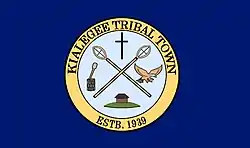 The flag of the tribe contains a sky blue circle, featuring a pair of stickball sticks, used in the traditional game still played at ceremonial grounds today. The black cross at the top represents the Christian religion. To the left is a hollowed log and beater, which women used to grind corn meal, central to Muscogee diets. At the bottom is a ceremonial lodge with a rounded bark roof, built on an earthwork mound. This lodge was the center of the tribal town for religious and civic gatherings and also a shelter for the needy. The earthwork mound refers to the Mississippian culture heritage of modern Muscogee people and the complex mounds that still exist of that culture. The bald eagle at the right is a sacred animal, featured in many tribal stories.[9]