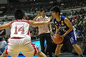 On his debut game in the PCBL for the Mighty Sports, he scored 16 points on top of five assists and three steals on their win against the Jumbo Plastic Linoleum Giants.[59] On May 18, 2016, despite having a jetlag, Ravena still managed to score 17 points (12 on the second quarter) to help his team sweep the Euro-Med Laboratory Experts on their best-of-three semi-finals series after missing Game 1 of their semi-finals match-up.[60][61] On May 22, 2016, he scored 20 points (15 points in the second half) to lead his team to victory in Game 1 of the best-of-three PCBL Finals against the Jumbo Plastics Linoleum Giants.[62] During their Game 2 match-up, against the Linoleum Giants, Ravena who was named the Most Valuable Player,[63] led the Cavaliers with 18 points, 4 rebounds, 2 assists and 2 steals in a losing effort.[64] He wasn't able to play in Game 3 of their match-up because he went straight to the airport right after Game 2 to catch a flight going to London to attend a celebrity volleyball match and spend time with loved ones.[65]