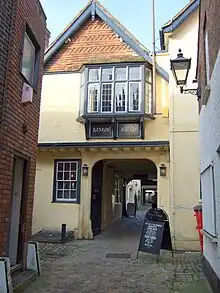 King Henry VI possibly stayed at the inn while on a tour of the country with his new wife Margaret of Anjou in the 15th century.[4] Later, a stained glass panel, previously in the nearby Greyfriars monastery, was inserted in the front window of the inn showing the king and queen's individual coats of arms.[4][5][6] The other coats of arms are of Cardinal Henry Beaufort, William de la Pole and the local Botlier family. That window is still there, though it is heavily protected.