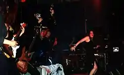 The band was formed in 1985 by vocalist King Diamond, guitarist Michael Denner, and bassist Timi Hansen.[1][2] The three had recently departed from the group Mercyful Fate, which fell apart due to musical differences between King Diamond and guitarist Hank Shermann.[1][2][4] According to Diamond, when he, Denner, and Hansen decided to form a new band, they chose the name "King Diamond" to "get better deals", and because the name was already known from Mercyful Fate.[1][2] To round-out the line-up of the King Diamond band, the group chose drummer Mikkey Dee and guitarist Andy LaRocque.[3]