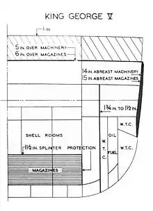 The armour protection of the King George V-class battleships was designed after consideration of the Royal Navy's experience of World War I and upon testing between the wars.[18] The design of this class was dominated by the provision of protection.[19] Magazine protection was given priority[20] through the provision of a thick belt and deck armour and by placing the magazines at the lowest levels of the ship.[21]