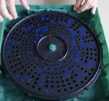 The board is "randomized" using three rotating discs, hidden inside the plastic frame of the game and containing varying hole locations; one player turns at least one of the discs before play begins. There are 1,728 (12³, or 12x12x12) permutations of oil wells. The rotating discs determine the depth of the wells that players will drill, with four possibilities:
