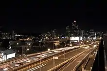 As originally constructed, the bridge had eight lanes across the Yarra River, two through lanes in each direction connecting King Street to Kings Way, in addition to two lanes on each side that connected to Yarra Bank Road. At the south end north facing on and off ramps connected to Whiteman Street, and the running lanes from the viaduct descend to ground level, with tram route 58 emerging from City Road to the median strip.[1] In the 1990s, the development of Crown Casino closed Yarra Bank Road, and the bridge ramps were connected to the basement carpark of the complex.[2][3]