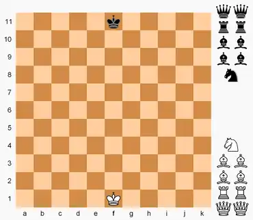 Also known as twin orthodox chess or double-king chess, each player has two kings[lower-alpha 3] and two queens on a 10×10 board. A player wins by checkmating either one of the opposing kings.[lower-alpha 4]