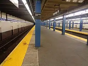 The station has three tracks and two island platforms. The tile band in this station is Marine Blue and vent chambers are also present.[9] White walls exist at the two northernmost platform staircases to the Kingsbridge Road exit. It is not known why they were built.