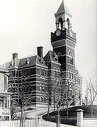 It is three stories tall, capped by a mansard roof shingled in polychromatic slate with a dentiled brick cornice and a front bell tower, all atop a regular ashlar limestone foundation. There are nine bays in the front, seven on the sides and ten on the rear. The red brick facing on the load-bearing walls is decorated with buff brick coursework at the window lintel and sill levels. Sandstone spandrels are located beneath all third-story windows.[1] Terra cotta is also used as trim.[3]