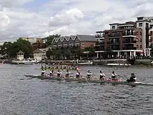 The regatta takes place in July and forms part of the Kingston River Festival.[2] It attracts top crews from schools, clubs and universities from around the UK. Racing takes place on the 1000 metre downstream course that stretches alongside Hampton Court Palace Park and ends just upstream of Kingston Bridge. International and Olympic rowers who have won at Kingston Regatta include Jack Beresford, Tim Crooks, Kieran West and James Cracknell.[3]
