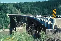 In 1978, the British Columbia Ministry of Highways and Public Works constructed a new bridge 3 kilometres (1.86 mi) west of the original bridge and realigned the Alaska Highway there. The bridge is accessible to vehicles and remains the only surviving curved, banked trestle bridge in Western Canada.[3]