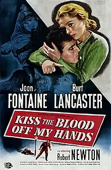 Kiss the Blood Off My Hands is a 1948 American noir-thriller film directed by Norman Foster. Based on the best-selling novel of the same name by Gerald Butler, it stars Joan Fontaine, Burt Lancaster and Robert Newton.[4][5] The film faced minor opposition from fundamentalist groups in the United States and the Commonwealth, with regards to its gory title. In some markets, the film was released under the alternate title The Unafraid (in Canada, Australia, New Zealand and smaller towns in the United States) or Blood on My Hands (in the United Kingdom).[6][7][8][9]