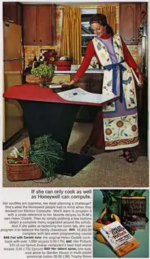 The Honeywell Kitchen Computer was a special offering of the H316 pedestal model by Neiman Marcus in 1969 as one of a continuing series of extravagant gift ideas.[18] It was offered for US$10,000[19] (equivalent to US$80,000 in 2022), weighed over 100 pounds (over 45 kg) and was advertised as useful for storing recipes. The imagined uses of the Honeywell Kitchen Computer also included assistance with meal planning and balancing the family checkbook – the marketing of which included highly traditional and patronizing representations of housewives.[20] Reading or entering these recipes would have been nearly impossible for the average intended user, since the user interface required the user to complete a two-week course just to learn how to program the device, using only toggle-switch input and binary-light output. To round out the domestic marketing, the pedestal model's writing surface was rebranded as a built-in cutting board and the computer would have a few recipes built in. No evidence has been found that any Honeywell Kitchen Computers were ever sold, though Honeywell did sell a small number (less than 20) pedestal computers outside of the Neiman Marcus branding.[21][22]