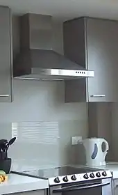A kitchen hood, exhaust hood, hood fan, extractor hood, or range hood is a device containing a mechanical fan that hangs above the stove or cooktop in the kitchen. It removes airborne grease, combustion products, fumes, smoke, heat, and steam from the air by evacuation of the air and filtration.[1] In commercial kitchens exhaust hoods are often used in combination with fire suppression devices so that fumes from a grease fire are properly vented and the fire is put out quickly. Commercial vent hoods may also be combined with a fresh air fan that draws in exterior air, circulating it with the cooking fumes, which is then drawn out by the hood.