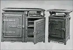 The first half of the nineteenth century witnessed a steady improvement in stove design. Cast iron stoves replaced those made of masonry and their size shrank to allow them to be incorporated into the domestic kitchen. By the 1850s, the modern kitchen, equipped with a cooking range, was a fixture of middle-class homes. In 1850 Mary Evard invented the Reliance Cook Stove, which was divided in two with one half for dry baking and the other half for moist.[8] Patents issued to Mary Evard are U.S. Patent 76,315 and U.S. Patent 76,314 on April 7, 1868.[9][10] She demonstrated this stove with her husband at the St. Louis World's Fair.[11]