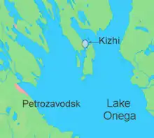 Kizhi (Russian: Ки́жи, IPA: [ˈkʲiʐɨ]; Karelian: Kiži) is an island near the geometrical center of Lake Onega in the Republic of Karelia (Medvezhyegorsky District), Russia. It is elongated from north to south and is about 6 kilometres (3.7 mi) long, 1 kilometre (0.62 mi) wide and is about 68 kilometres (42 mi) away from the capital of Karelia, Petrozavodsk.